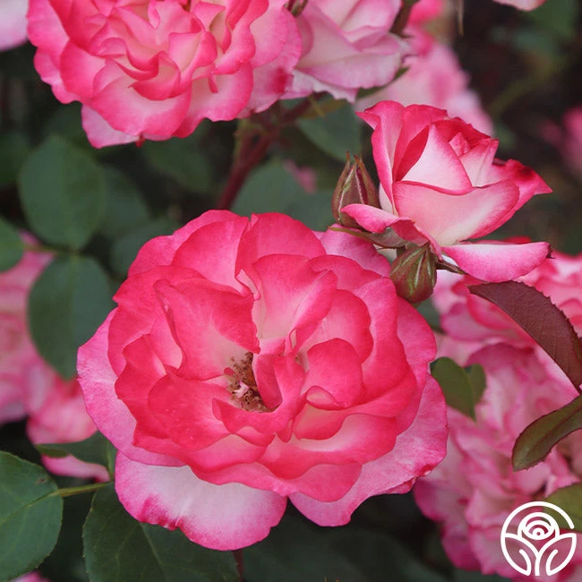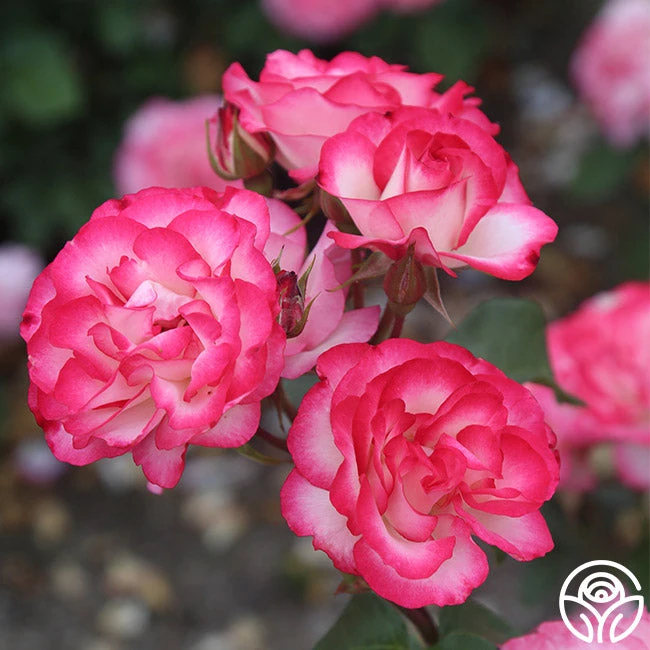Nicole is a lovely Floribunda with outstanding 3-4” blooms with 35+ petals in crystal white brushed with pink toward the petal edges. She has large, dark green, semi-glossy leaves and is a continual blooming bush. Nicole is a vigorously growing bush with a light fragrance. Gardeners love her color changing as her flowers age.