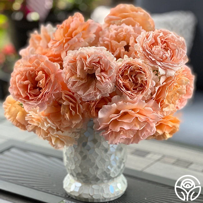 FAN FAVORITE! The large, many petaled, old-fashioned, 5″ blooms with 50+ petals are a blend of several shades of apricot and peach. Polka’s old-rose fragrance perfumes the air through the extended bloom season with an abundance of blooms set against leathery, light green foliage. She has strong disease resistance and is a favorite of the staff at Heirloom Roses!