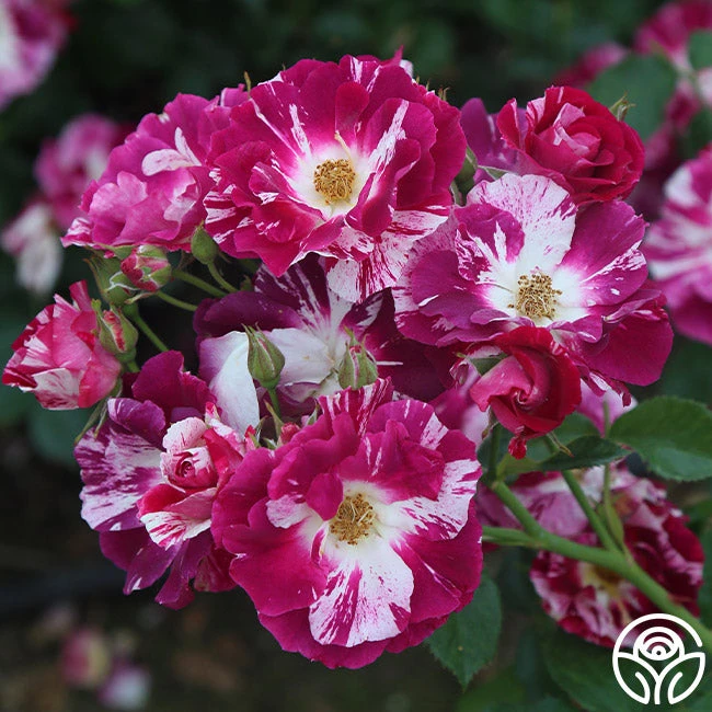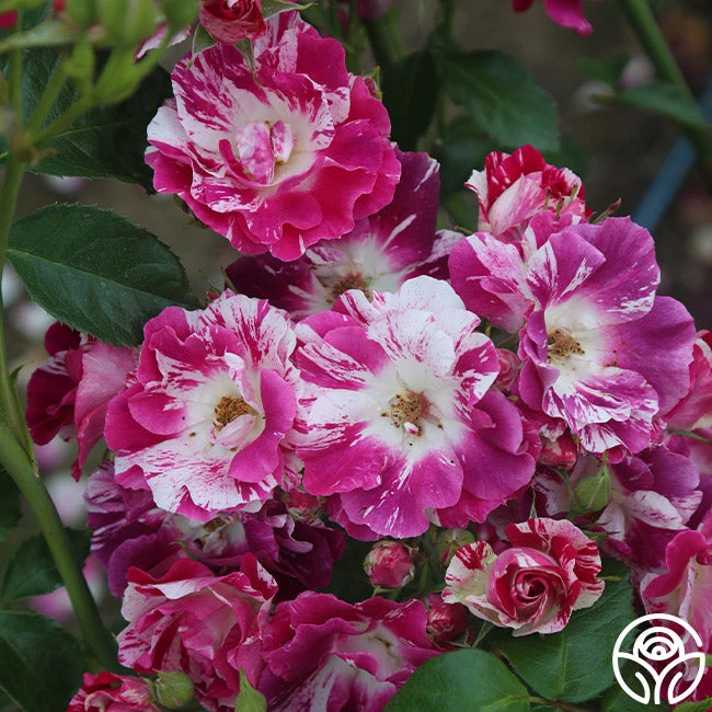 Wine-purple and white striped, speckled blooms with a sweet apple fragrance cover all 9-13â of Purple Splash. This stunning roseâs blossoms are produced in clusters on nearly thornless canes. Her unique flowers stand out against medium, glossy green foliage.