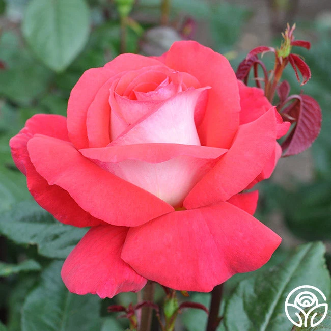 Like her parent plant, Fragrant Cloud, Typhoo Tea packs a punch with her strong, citrus-spice fragrance. This bi-color rose of salmon with a silvery white eye reverse has classically shaped blooms with a petal count of 35+ stretching across a diameter of 4-5”. She blooms in flushes throughout the season but prefers cooler weather and doesn’t tolerate excessive heat.